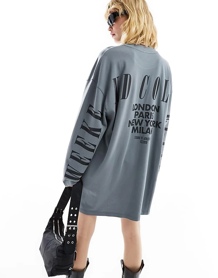 ASOS WEEKEND COLLECTIVE Weekend Collective Oversized Long Sleeve T-shirt Dress With Back Logo In Charcoal Wash For Women