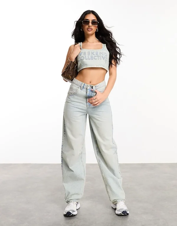 ASOS WEEKEND COLLECTIVE ASOS DESIGN Weekend Collective Denim Bralet With Raw Edge Logo And Jeans Co-ord