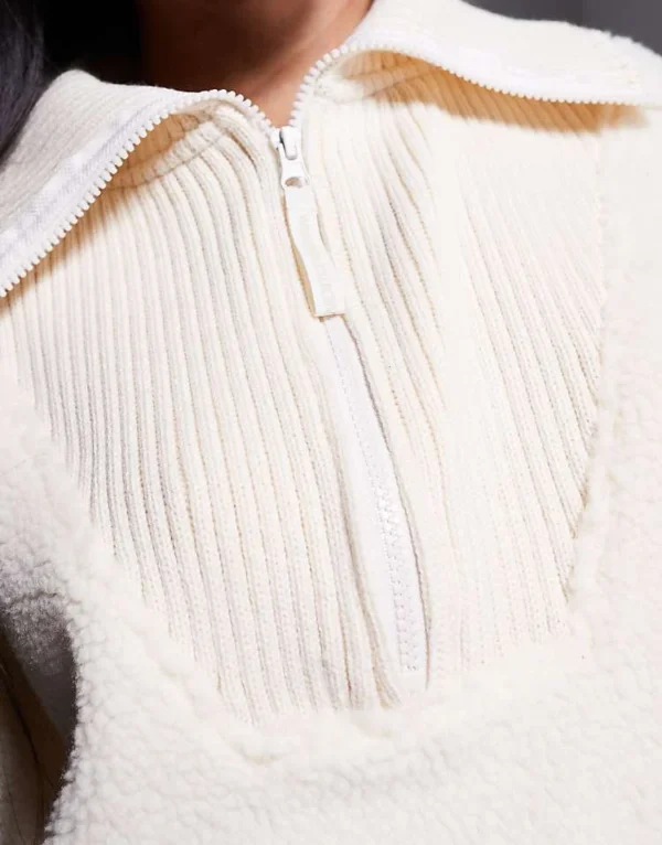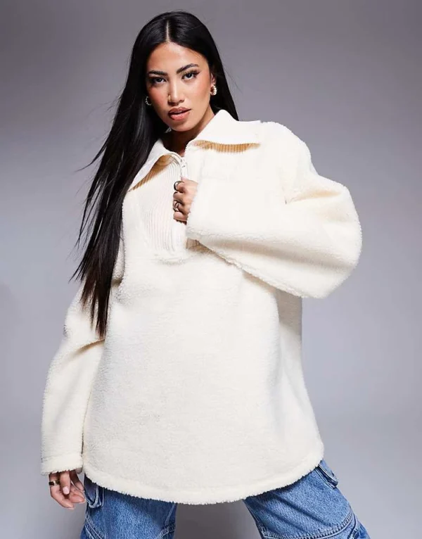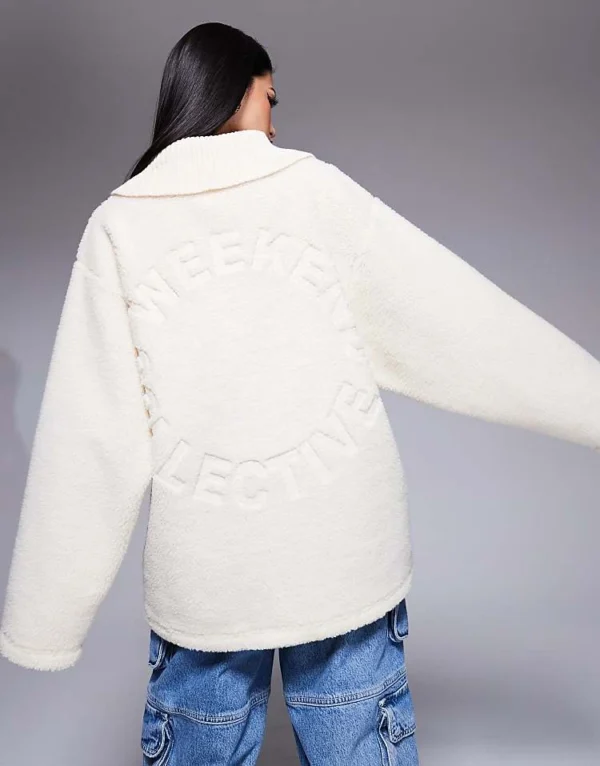 ASOS WEEKEND COLLECTIVE Weekend Collective Rib Neck Zip Through Borg With Embossed Back In Cream For Women