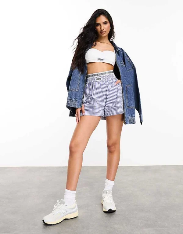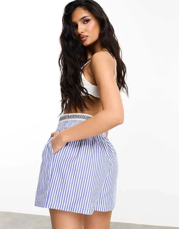 ASOS WEEKEND COLLECTIVE Weekend Collective Boxer Short With Elastic Waistband In Blue Stripe For Women Blue & White